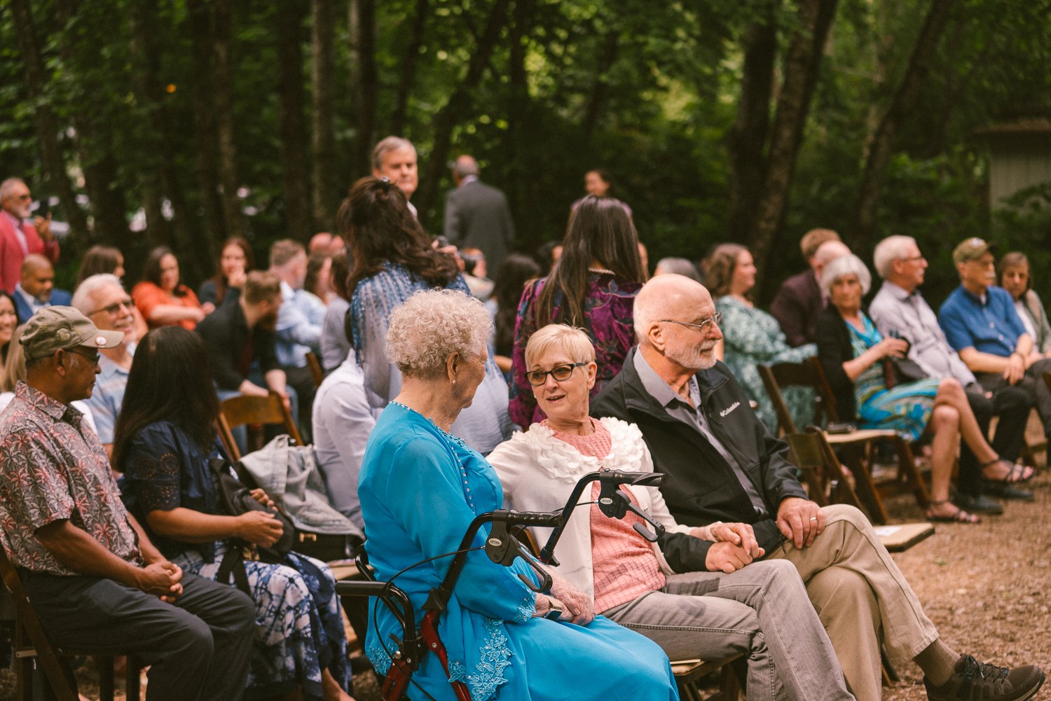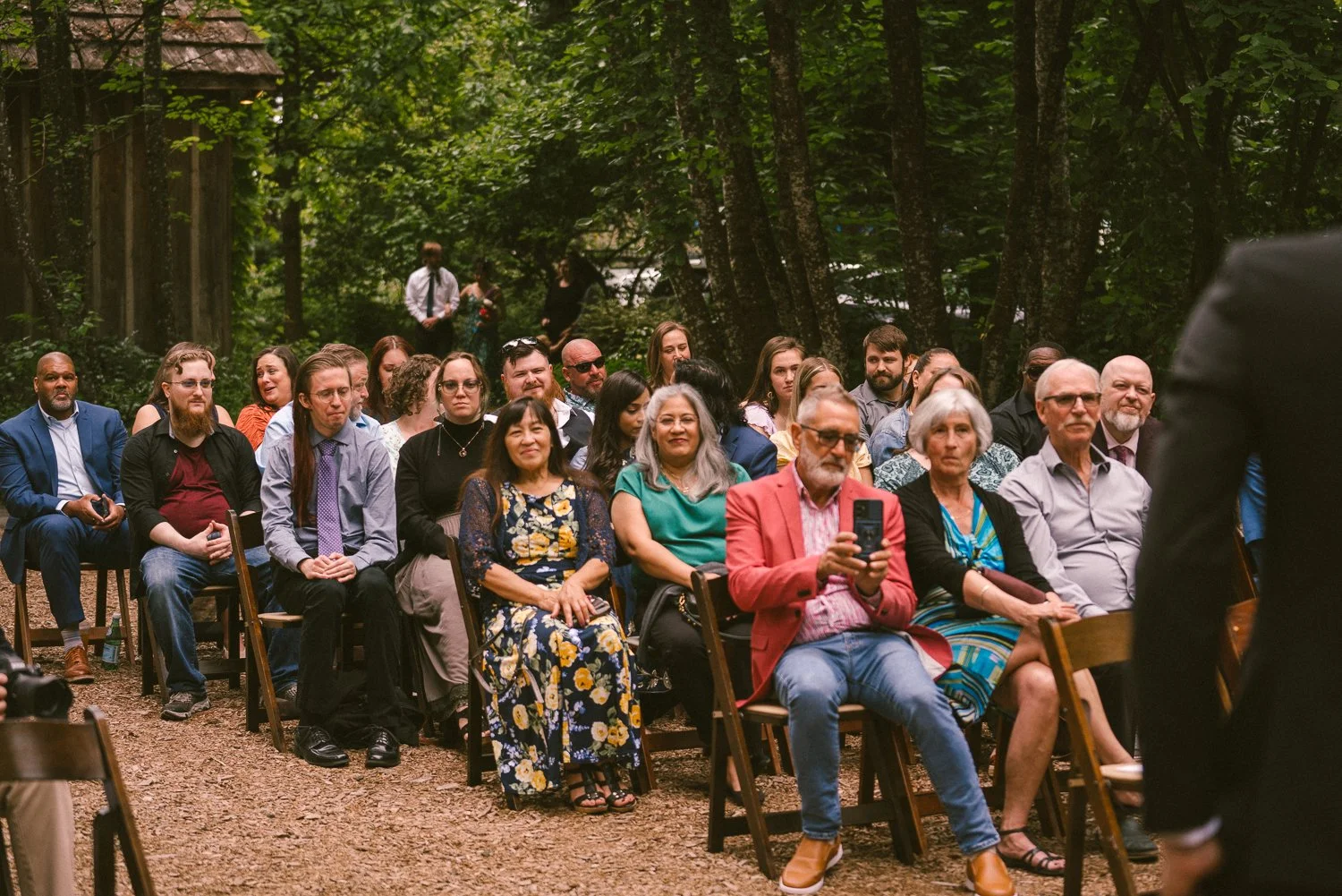 After a sweet first look in the house, we made our way to McMenamins where the couple shared additional emotional first looks with their families in the wide-open meadow—a peaceful, leafy space perfect for portraits. Their ceremony took place just outside the iconic Octagonal Barn, surrounded by friends, family, and the sweet flower girl who scattered petals down the aisle. Heartfelt readings from the maid of honor and best man added even more warmth to an already beautiful moment.